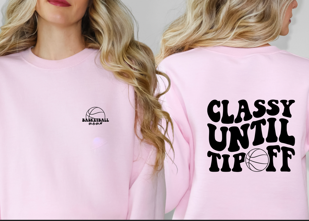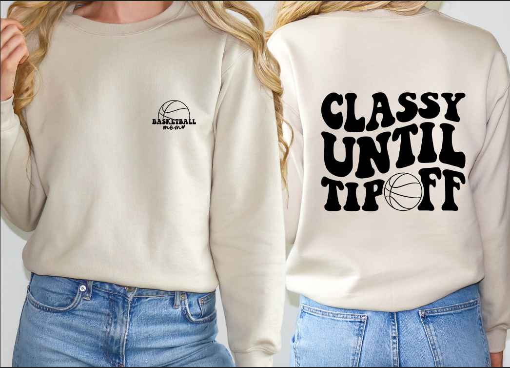 Get ready to be "classy until tip off" with this must-have basketball mom pullover! Whether you're in the stands or on the go, this pullover will keep you looking and feeling stylish. Don't sacrifice style for comfort, get the best of both worlds with Classy Until Tipoff.